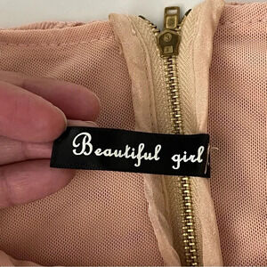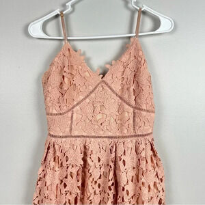 FIT & FLARE LACE CAMI DRESS by BEAUTIFUL GIRL SIZE SMALL with Pockets. With a dress as pretty and stylish as this fit and flare lace creation, you are sure to make heads turn. This pink dress features a beautiful floral guipure lace construction. It flaunts a V-neckline with noodle straps, a cinched waist, and a concealed zip closure at the back. Pair it with platform sandals and a clutch for that special brunch outing. 15.25” chest, 13.5” waist, 41” length. #587