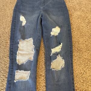 Elevate your casual style with these trendy Fitjeans in a stunning azure blue color. These super ripped high-waisted jeans have a regular fit and come in a size S with a 28-inch inseam. The skinny style is perfect for a flattering and comfortable fit, while the medium fabric wash adds a touch of vintage charm.