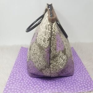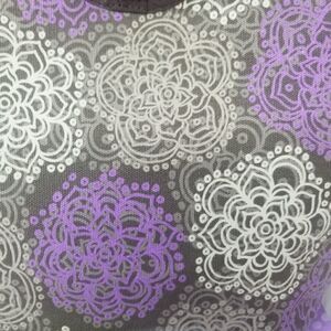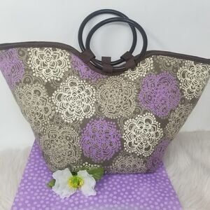 Purple creams and tan coloured insulated lunch tote with round handles. Approximate measurements are 16" x 10" x 6". Handles are approximately 5" diameter. Good clean used condition. Nice and roomy. Three snaps at the top for closure.