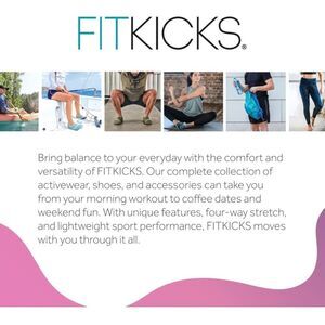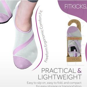 The FITKICKS women's sneakers in gray are designed for versatility and comfort. They feature a durable flex form sole and an easy slip-on design, making them ideal for activities such as traveling, yoga, and beach outings. The shoes offer ergonomic comfort with extra breathability and a protective toe guard. They fit US shoe sizes 8.5-9.5 and are pre-owned. they were tried on and worn around the house but has a little stain see last picture
