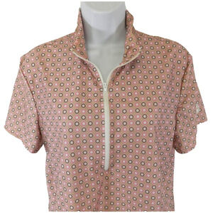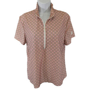 This Women's Fit Athletic Top in size L features a geometric pattern in multicolor, perfect for activewear occasions. The high neck and short sleeves add a style touch to this zip closure top. Made of polyester and Lycra, the lightweight and breathable material ensures comfort during activities like gym training, cross-training, and running. The stretchy fabric provides a comfortable and athletic fit for the active woman on the go.