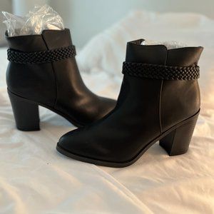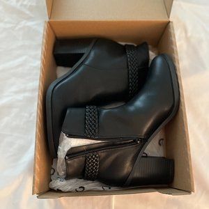 Braided strap detail. 3.5” stacked block heel, vegan leather.
