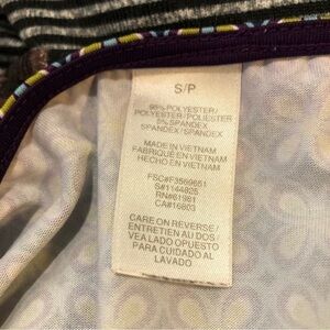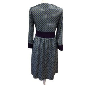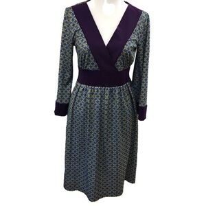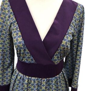 1970’s “Flower Power” inspired print dress with solid contrast trim. V-neck. Sleeves are 3/4 length and have a slight flare at the cuff. Very good pre-owned condition. Size S