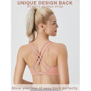 Sports bra features strappy back, removable pads, stretchy elastic material for added comfort.