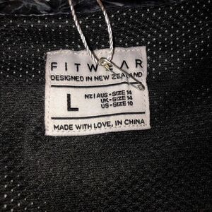 Awesome windbreaker by FITWEAR. This is The Lush Windbreaker in a full-zip style in black and white marble. It’s water resistant and 100% polyester. It has an elasticized hem and is vented on both front and back with sport mesh lining. Locking zippered hand pockets on both sides (very roomy). Fitwear logo in dark gray on back hem. Adjustable cords along collar (no hood) and adjustable cord at neckline with plastic locks. This is labeled as a size large, but it’s also stated that it is a size 10. The pit-to-pit measurement is 26”, the length is 28” and the elasticized sleeves are 22.5”. Really nice. NWT!