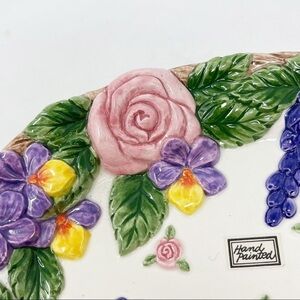 FITZ & FLOYD 1994 Embossed Oval Plate Roses, Violets MAYFAIR Floral 9.5” X 7.5”. Good pre-owned condition. A few tiny flea bites that are not noticeable. See photos. All measurements are approximate.