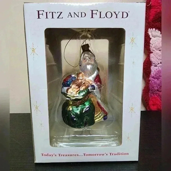 FITZ & FLOYD SANTA WITH TOY BAG GLASS CHRISTMAS TREE ORNAMENT 2002 With Box