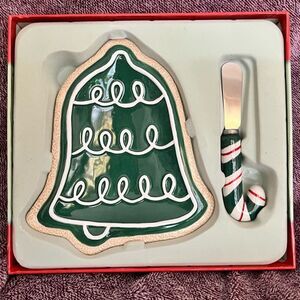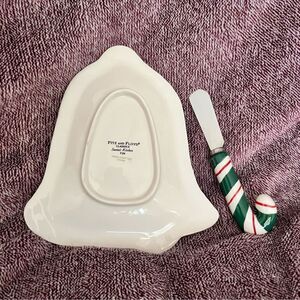 Set includes a bell-shaped snack plate and a candy cane spreader