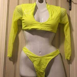 FJ swimsuit Mesh long sleeve plunging Neck Brazilian bikini set - neon