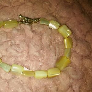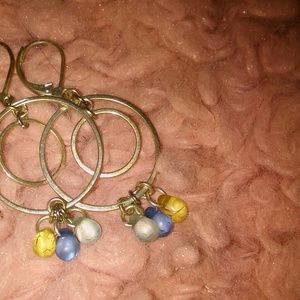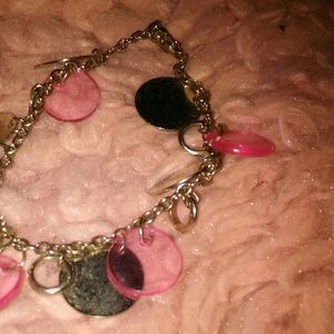 Blue/yellow circle earrings, toggle clasp shell bracelet, Urban outfitters gold-tone bird necklace (16 in + extender), silver/pink disc bracelet.