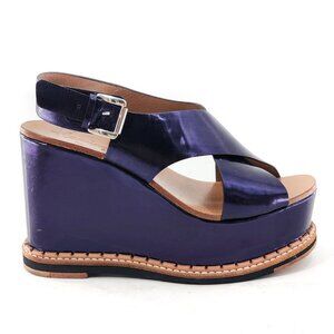 FLAMINGOS Trendy Metallic Blue Leather Platform Wedge Sandal Open Toe Buckle Closure Criss Cross Slingback