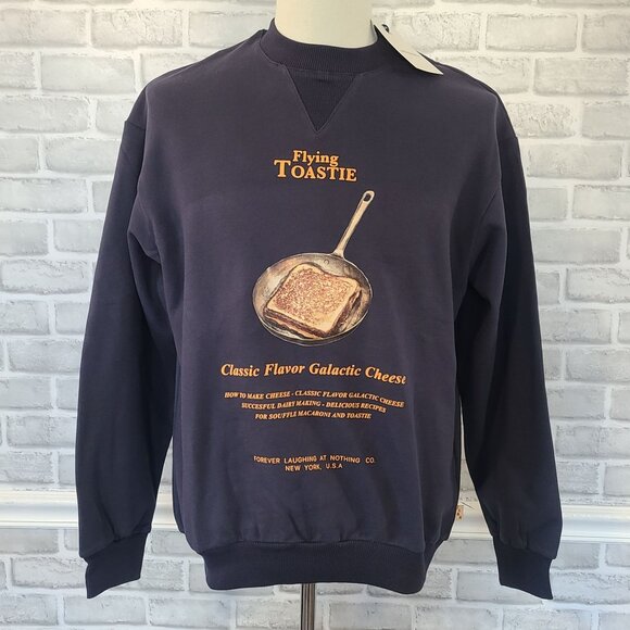 FLAN Flying Toastie Grilled Cheese Graphic Sweatshirt Mens Small Navy Blue NEW