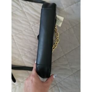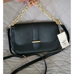 The FLAP CLOSURE CROSSBODY STRAP SATCHEL MESSENGER STYLE HANDBAG is a stylish and practical accessory for women, featuring a rectangular shape with a black exterior and gold accents. This purse has a magnetic closure and comes with a detachable crossbody strap and a gold tone chain tote style strap,, making it versatile for casual or business occasions. The faux leather material and lined interior with inner pockets provide durability and functionality, while the adjustable and detachable crossbody strap adds comfort and convenience. Perfect for everyday use, this black and gold satchel is a chic and trendy addition to any outfit. This is a Pre-owned item and has some minor scuffs on the exterior, excellent and clean on the interior and still has the tags attached. Originally 32.99