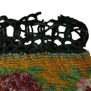 Vintage beaded coin purse with floral design and drawstring closure, circa the 1930s or the close of the Art Deco period. This small purse is made of delicate Czechoslovakian glass beads in a floral motif with lovely red rose as the central feature. It is heavily beaded on both sides. The top of this little coin purse is crocheted with green colored cotton thread.