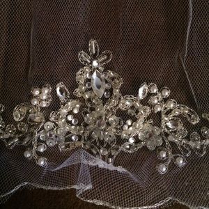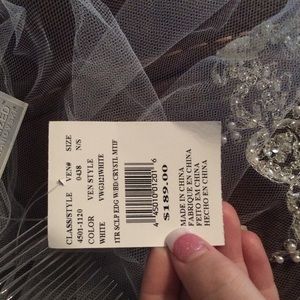 Band new! Never out of the package except to take pictures of course. Absolutely gorgeous long flowing veil! Matches the wedding headband also in my closet! Sadly my wedding day got canceled so neither of the items have been worn!! Or even tried on!