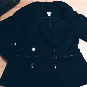 Like new Cache double breasted black blazer jacket. Stretchy fabric, 3/4 quarter sleeves, and beautiful details. Patent leather piping around the waist and patent leather finish around the buttons. This classic cut can easily be dressed up or down.