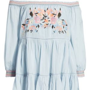Cut with an of-the-moment off-the-shoulder neckline, vibrant threads and puffed peasant sleeves. Boasts a tiered A-line shift with stunning embroidery at the bust.
