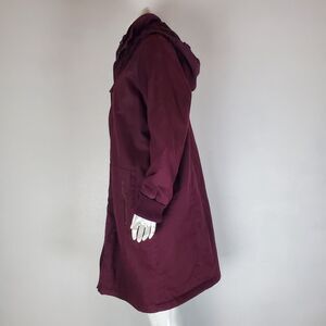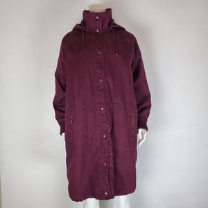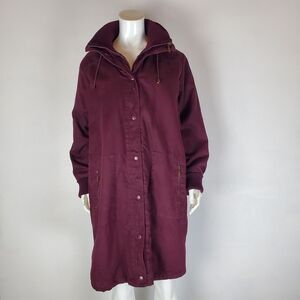 Vintage 90's Hunters Run purple midi parka coat. Has detachable hood, ribbing at neckline and sleeve cuffs, zipper and snap button closure, 2 hip zippered pockets, and purple lining. Shells is 55% ramie, 45% cotton. Lining is 100% polyester. Vintage size M. See measurements for fit. Measurements lying flat in inches approx: Shoulder to shoulder 18 Armpit to armpit 25 Waist 25 Hips 25.5 Length 37.5 Sleeve length 27 (24 with ribbing folded) Zipper is broken but can still be closed with snap buttons. Otherwise is great vintage condition without stains, rips, or holes. No trades. vtg, 1990's, utility jacket, retro, alternative, altgirl, indie, hipster, twee, walking, casual, winter, autumn, fall, jewel tones, eggplant, oversized, heavy weight