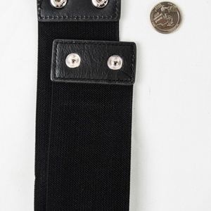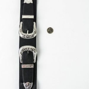 Double is always better with this double western buckle belt. Metal detailing and elastic waist band with back snaps.