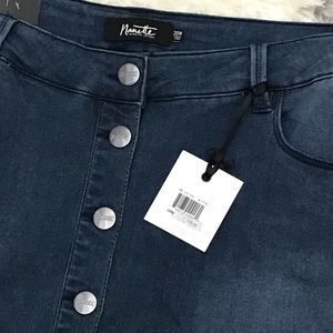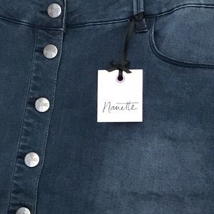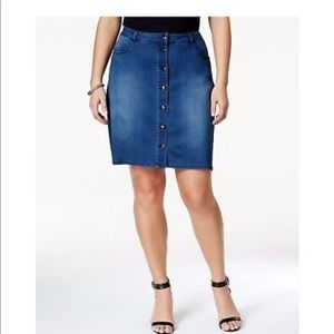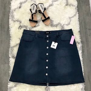 Denim faded color with front hardware silver buttons and side pockets. Hits above the knee, stretch. 52% Rayon, 25% Polyester, 21% Cotton, 2% Spandex. Dry clean only. A-line style. Waist 41” Hips 48” Length 20”. NWT in great condition except for some minor snag but not noticeable. See last 2 photos.