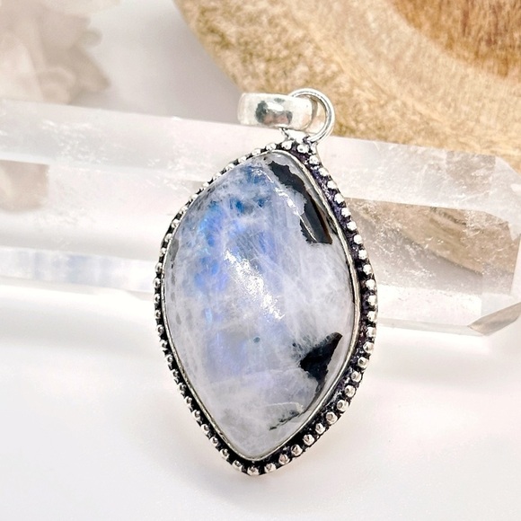 FLASHY Rainbow Moonstone & Black Tourmaline Sterling Silver Gemstone Pendant