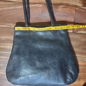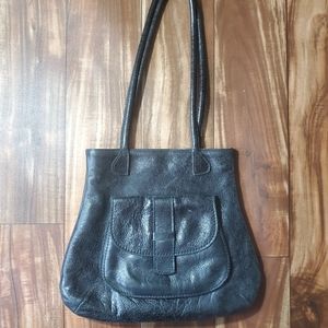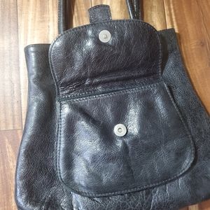 Black leather shoulder bag with front flap pocket. Magnetic closure. Leather has lightly distressed quality giving a vintage look. Great condition