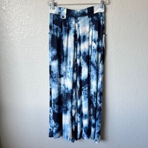 * Features: button over belt loop design, pleated front pockets, button fly closure, full skirt in feather light and airy fabric with varied blues throughout.