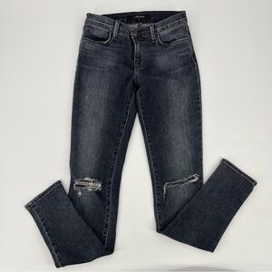 J brand gray black 25 skinny jeans have a blown out knee and stains