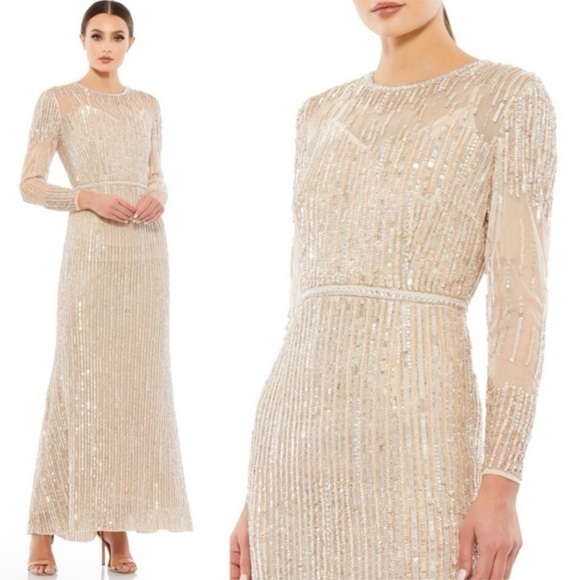 This stunning gorgeous long dress features a long sleeve high round neckline. This sheer long sleeve A-line gown features all-over sequins over a camisole lining. Vertical rows of sequins and beads adorn the bodice, skirt, and sleeves, and the natural waist and neckline feature hand-sewn crystal accents. This dress is perfect for any special occasion.