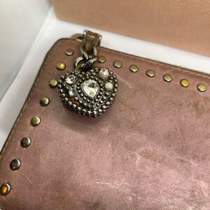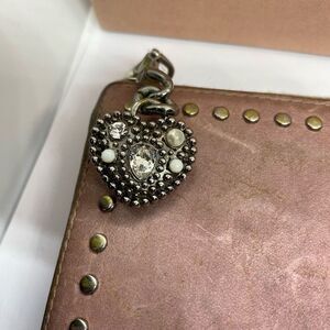Item is pre-owned with a lot of wear… plating wear on metal parts, one missing “stone” on one side of heart charm, excessive scratches/scuffs and worn in dirt throughout. Item needs a thorough leather cleaning but otherwise is structurally sound, with a lot of life left. Comes with original box.