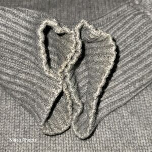 This is a Gap hoodie sweater made of 100% cashmere in a solid gray color. It features a tight-knit style with long sleeves and a hood. The sweater is designed for women in size L, with a regular fit. It is part of an AIDS awareness collaboration. The garment care instructions specify dry cleaning only.