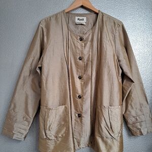 rollable sleeves, one pleat down the back, pit to pit 22.5" sleeve 24" length 29"