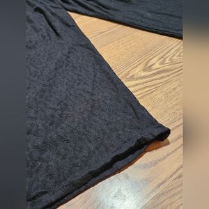 Elevate your wardrobe with these stylish black wide-leg pants from FLAX, designed by Jeanne Engelhart. These dress pants feature an elastic waistband and are made of comfortable knit rayon fabric and textured with a delicate floral pattern.