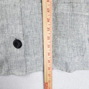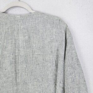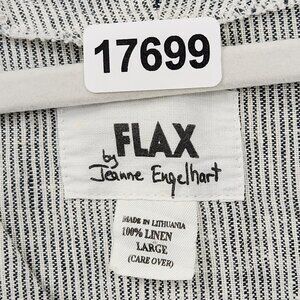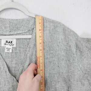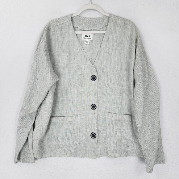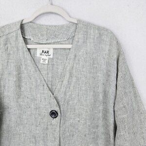 FLAX Jacket Womens Large Gray Jeanne Engelhart Linen Striped Button Front V Neck. In very good pre-owned condition. No flaws noted.