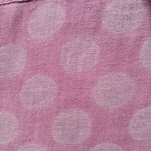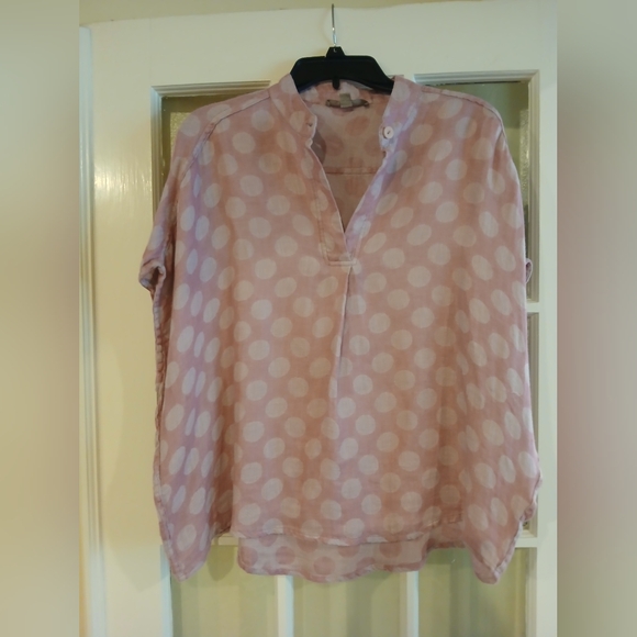 Lovely Flax linen top. I had to take outside to photograph the color. The last 3 pics are accurate. Pretty pink/ lavender colr with white polka dots. One button at neck in front. Loose fitting Petite but it fits me and I can wear a 12/med.