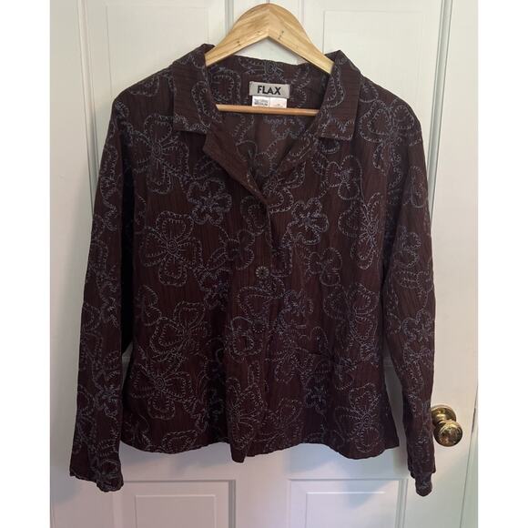 FLAX Medium Brown Corduroy Collared Lightweight Jacket Blue Embroidered Floral