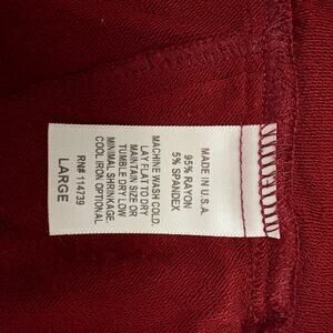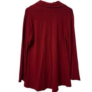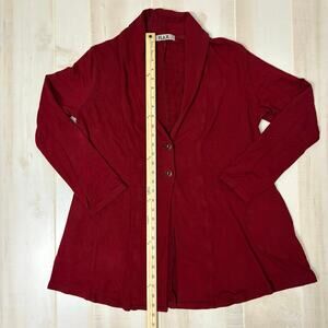 Beautiful deep red FLAX cardigan jacket in size Large, made in the USA from a soft and stretchy rayon blend (95% rayon, 5% spandex). Features two front buttons, draped hemline, long sleeves, and convenient side pockets. The fabric has a smooth, medium-weight feel with excellent drape. Approximate measurements: 25” length, 22” pit to pit when laid flat. A versatile and comfortable layering piece perfect for casual or artsy looks. Machine washable and easy to care for. Excellent pre-owned condition.