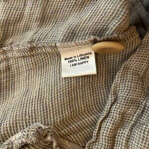 Design: Button-front v-neck linen jacket with little pockets at lower front. Unlined.