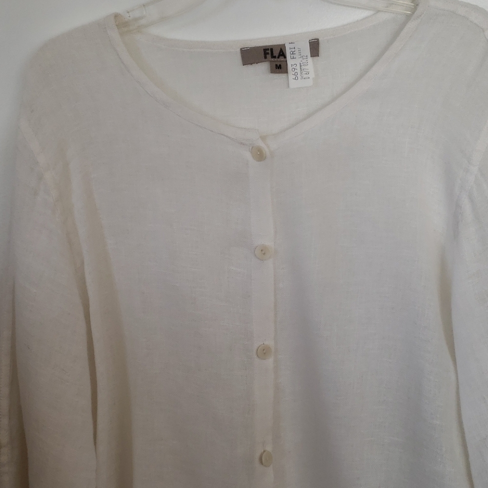 Comfortable flax long top. Or use as cover up. Long sleeves but can be rolled up. Wear anywhere. SIZE M. Excellent condition. Approximate measurements pit to pit 22.5 length 32. B400