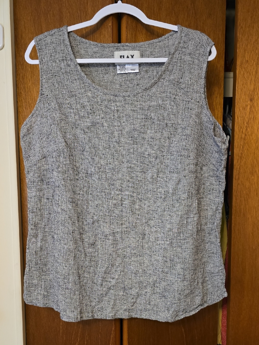 Awesome sleeveless top and excellent use condition. Bust is darted. Pit to pit 22 top to bottom 25.5 Flax size 1 g. Approximately extra large.. Material is stretchy