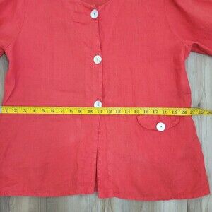 FLAX Women's Jacket Top in Coral 100% Linen Size Small with mother of pearl 3 buttons layered lightweight Jacket. Natural breathable fabric, in Good pre-owned condition! Please see photos for approximate measurements.