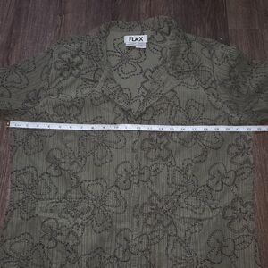 Elevate your layering game with this FLAX women’s button-up jacket in size Medium. Crafted from 100% cotton and made in Lithuania, this jacket features an olive green base with tonal vertical striping and all-over floral embroidery in dark thread for a unique, artisan-inspired look.