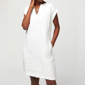 Elegant lightweight linen dress with pockets, soft v neck neckline and cap sleeves. Excellent used condition. See photos for measurements