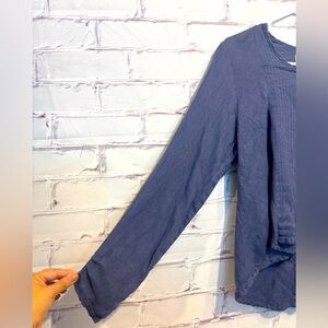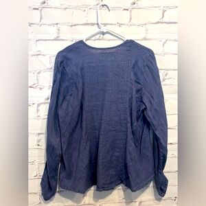 Effortless and timeless, this FLAX navy blue tunic top blouse is designed with a button-down front, long sleeves, and a classic round neckline. Crafted from lightweight, breathable fabric, it drapes beautifully for a flowy, airy, and relaxed fit. The oversized silhouette offers both comfort and versatility, making it perfect for layering, casual wear, travel, or minimalist styling. A chic and easy-to-wear piece that embodies the fresh, natural aesthetic FLAX is known for. Women’s Size Small with an intentionally oversized cut.
