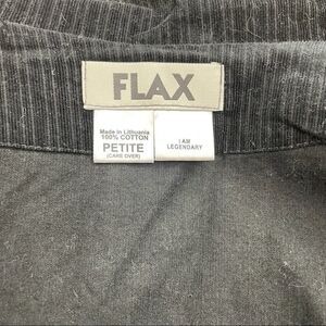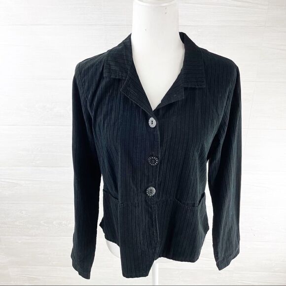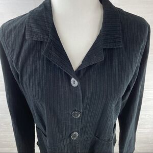 FLAX velvet button down blazer jacket size petite (size 4-6- see size chart). Black striped cotton with velvet feel. Button from closure and foldover collar. Smocked waist. No holes or stains.