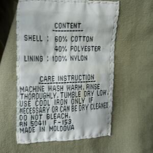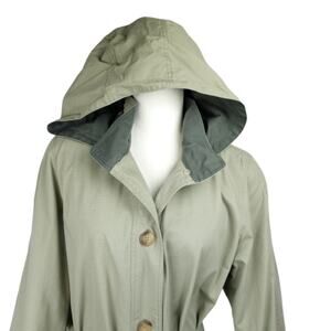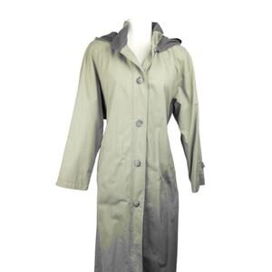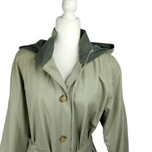 Sage green shell trimmed in army green inside the button-on hood and trim. Button front and belt. Fully lined.