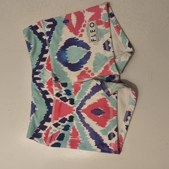 Vibrant FLEO shorts with a colorful pattern. Features pink, blue, and green hues.