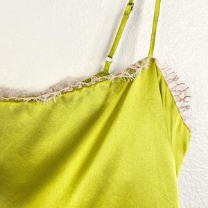 100% silk. Lace trim. Waist length style. Boat neck. Sleeveless. Adjustable straps. Dry clean. Chartreuse yellow-green with pink lace. Sold on FWRD, Shopbop, and intermix. New with tags.