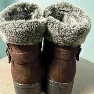 Pre Owned FLEXUS Brown Bootie Shoe, Zipper Closure, with Ornament Buckle. Outside is Faux Suede. Inside of shoe is lined with Faux Fur. Size 6. Note on Right Shoe there is a dark shade on the side of the shoe.