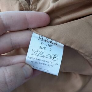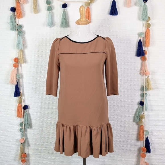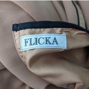 Tan and black dress from Japanese brand FLICKA with ruffle skirt. Dress has pockets and oversized fit.